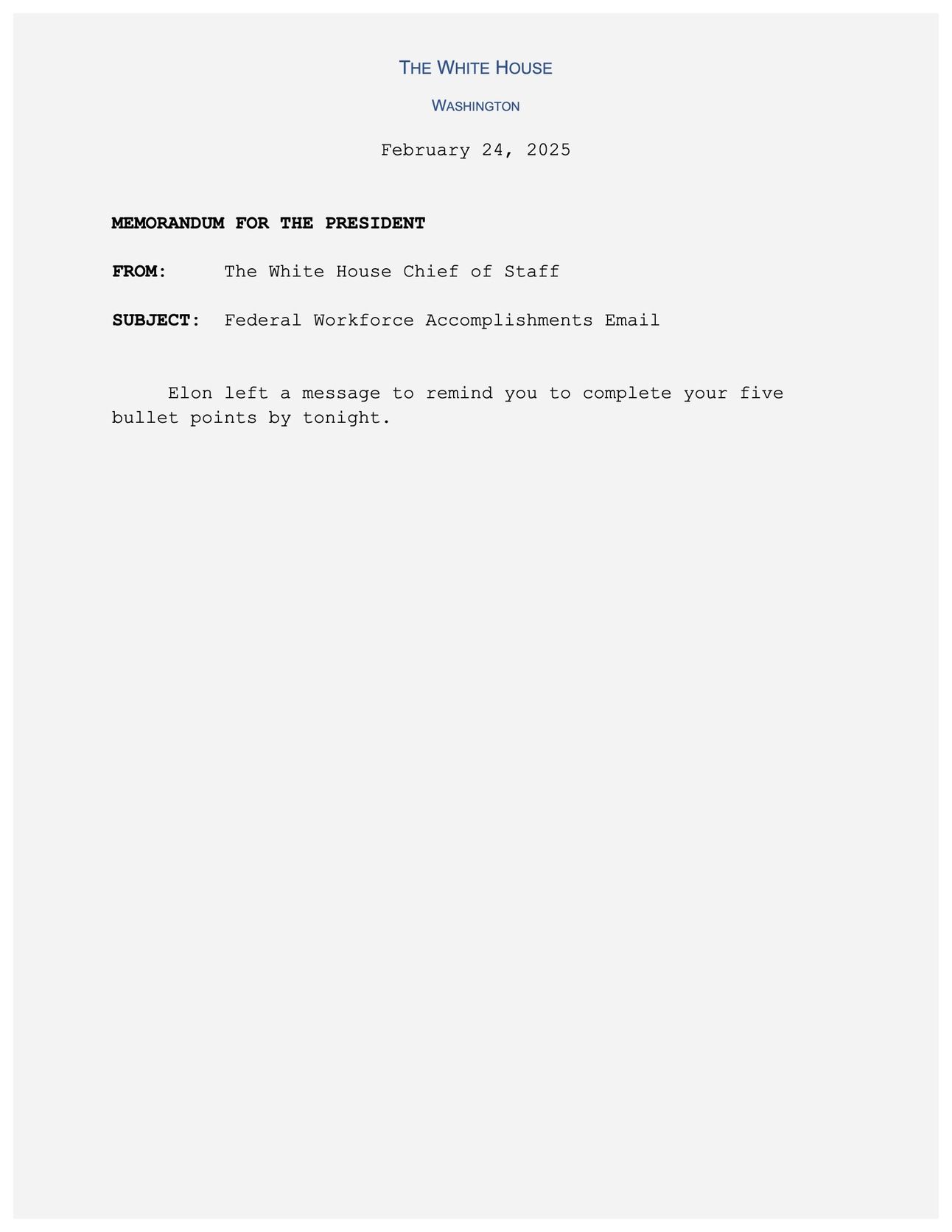 Leaked Memo to Trump on Musk's 5 Bullet Points Email